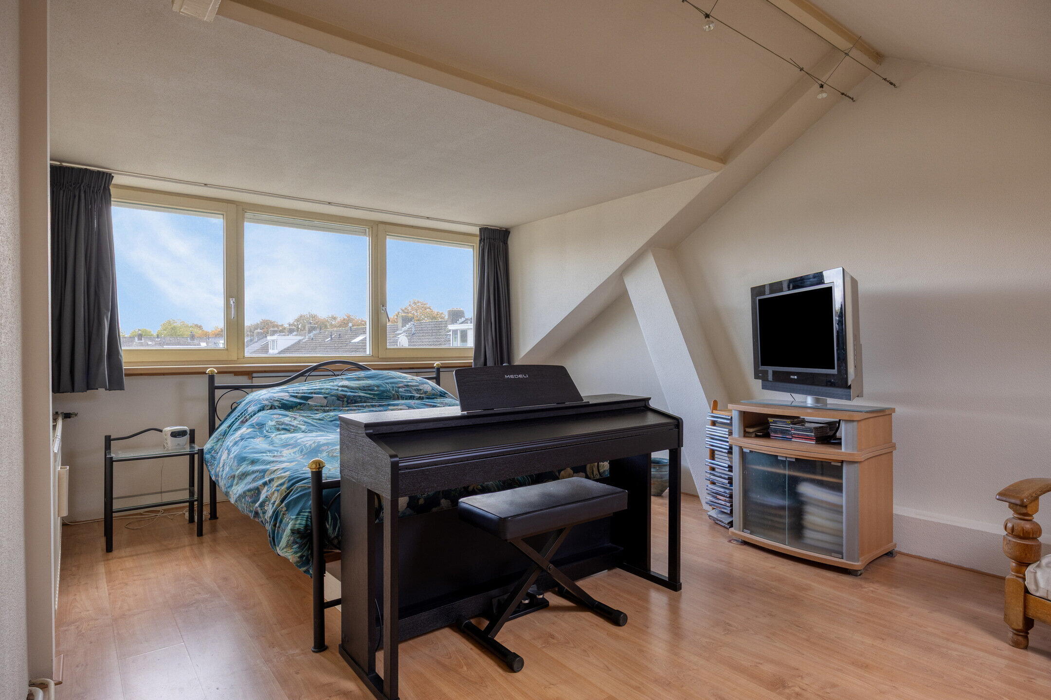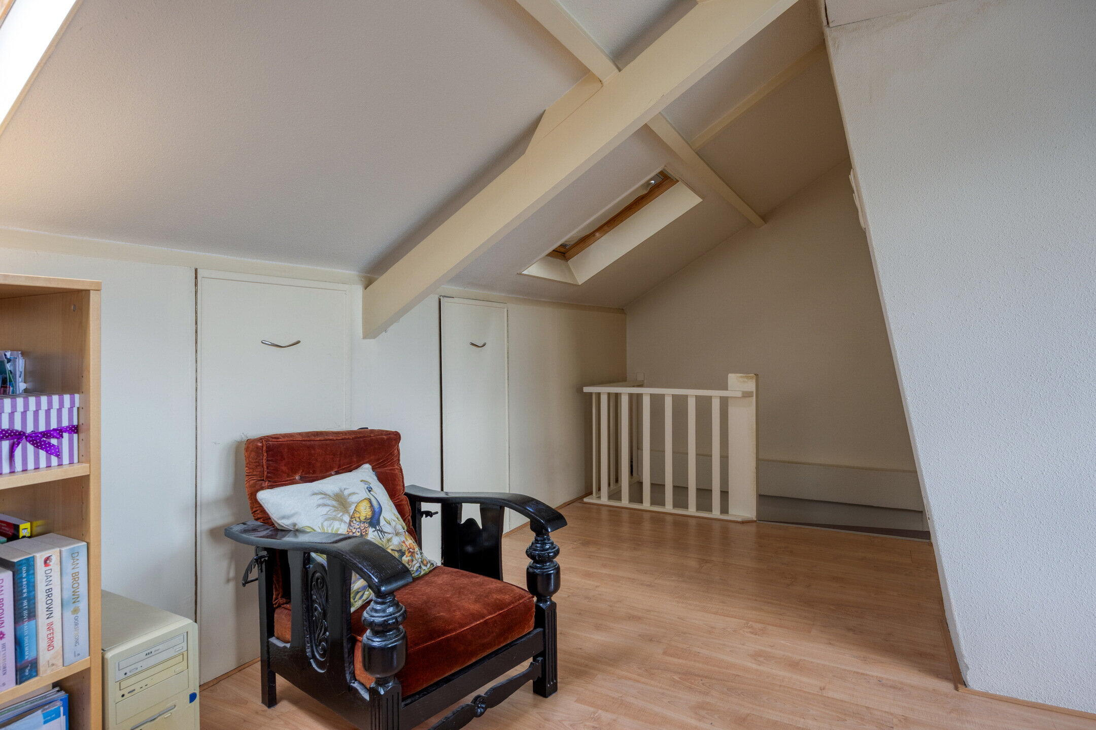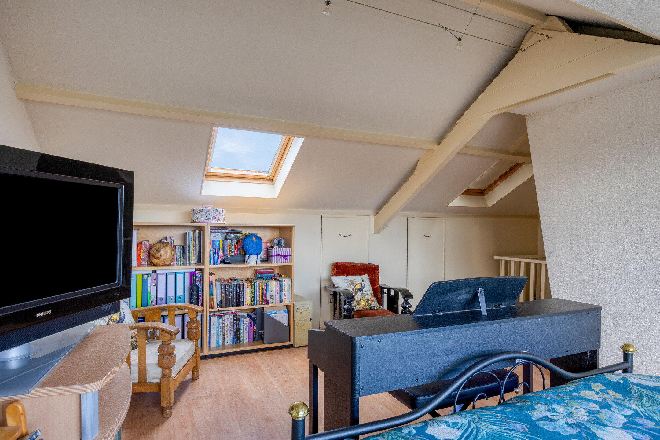 Via vaste trap bereikbare ruime zolderkamer met dakkapel over de gehele breedte, 2 dakramen en veel bergruimte in de inbouwkasten en achter de knieschotten.