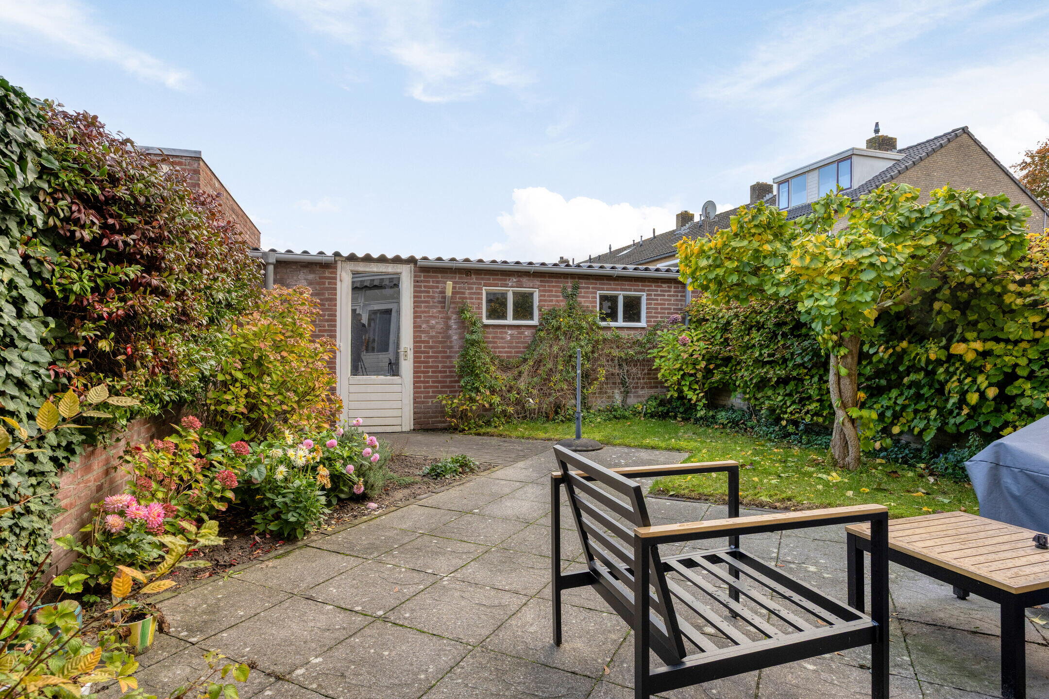 De tuin is voorzien van fraaie planten, borders, een terras en een stenen berging met achteringang.