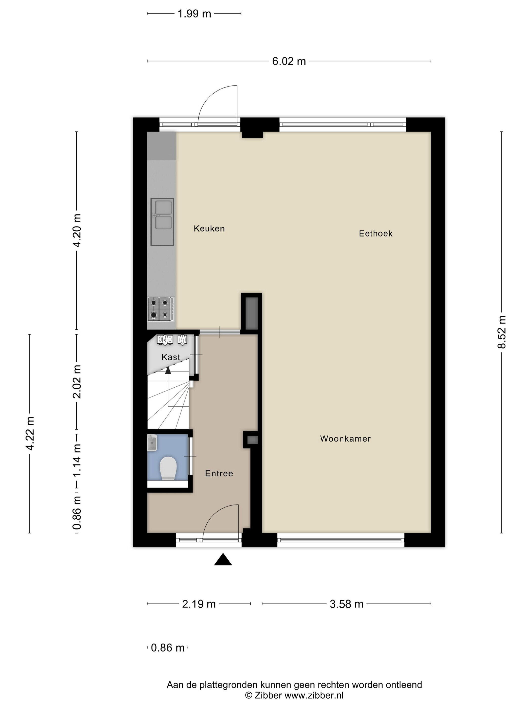 Vanuit de entree met toilet en trapopgang loop je rechtdoor de open keuken en woonkamer in. Door de grote ramen voor en achter is de woonkamer lekker licht. De keuken is eenvoudig en voorzien van een gasfornuis, oven, koelvriescombinatie en een vaatwasser. Via een deur in de keuken is er toegang tot de op het oosten gelegen achtertuin. De gehele begane grond is voorzien van een laminaatvloer.
